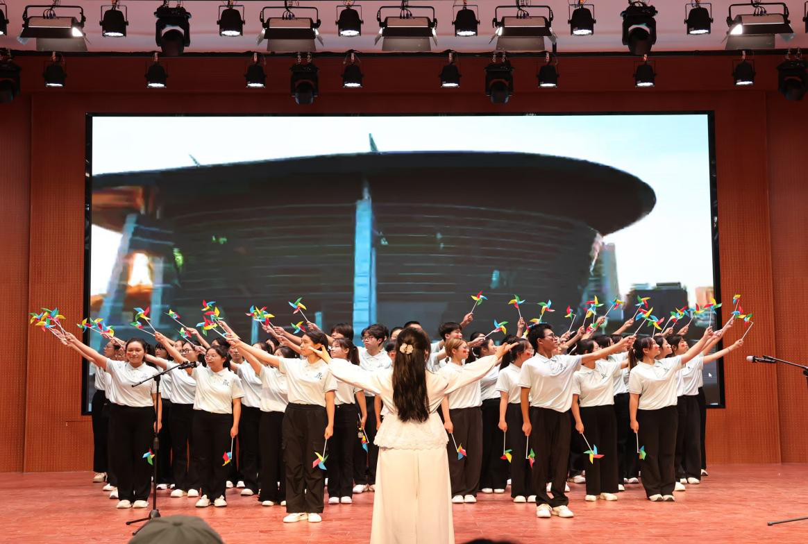 舞台上,同学们着装整齐,以深情的歌声演唱师大校歌《托起民族的希望》与《我们都是追梦人》,激昂旋律引发全场共鸣;用创新的舞台剧串联起母校五十年发展历程,从筚路蓝缕到蓬勃兴旺,生动展现师大蓬勃向上、历久弥新的生机活力。他们用自信的笑容、投入的表演生动诠释“厚德 崇实 善学 敏行”校训,以嘹亮歌声与精彩演出传递对母校的赤诚热爱与美好期许,彰显了教科院学子昂扬向上的精神风貌。